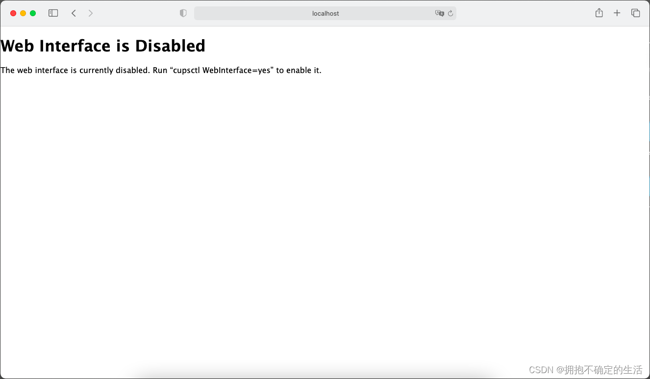 The web interface is currently disabled. Run "cupsctl WebInterface=yes" to enable it.