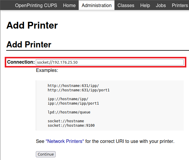 1. Then type the printer's IP address on Connection using the prefix socket://.