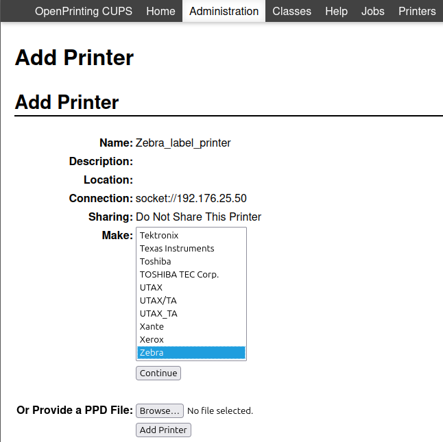 NOTE Providing a PPD File is only used for instances when a Make: (the field that you need to select above) is not available, the manufacturer has provided a PPD file to you to populate manually. Assistance for Zebra printers from Zebra is not available for PPD files, only available when the available Zebra option is selected.
