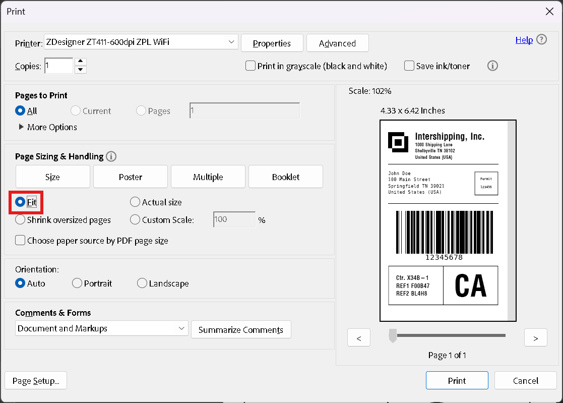 Be sure to check the option that fits the PDF file to paper size, the name may vary according to the client you are using. You can see 2 examples below: