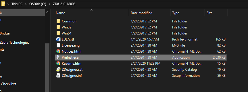 - The installer file extracts to a folder in the C drive, for example C:\ZD8-2-0-18003.